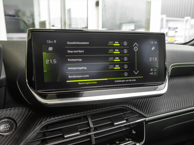 - Dashboard in zacht materiaal met carboneffect afgewerkt met groen stiksel, glanzend zwarte inleg en chroomeffect